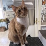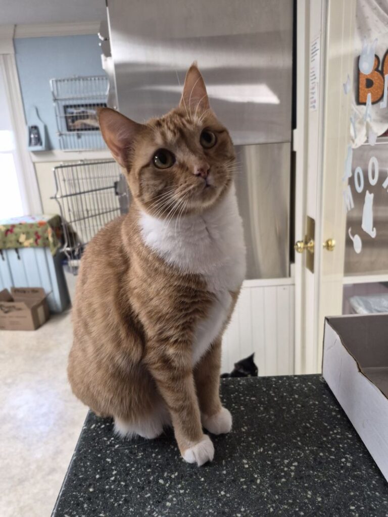 2. TOM is a handsome dude who needed a place to live. We welcomed him in the fall of 2021. After a complete workup with Dr. Moss, it was found that Tom had spleen cancer. His spleen was removed and he has recovered nicely. He is being watched closely for a recurrence. Tom is sweet and gentle and likes to sit on the counter and greet people as they come into the room. No one would ever guess Tom is 20 years old. He has adapted well to the shelter and we feel blessed to have him with us where he is safe and warm. We love Tom and will take good care of him.